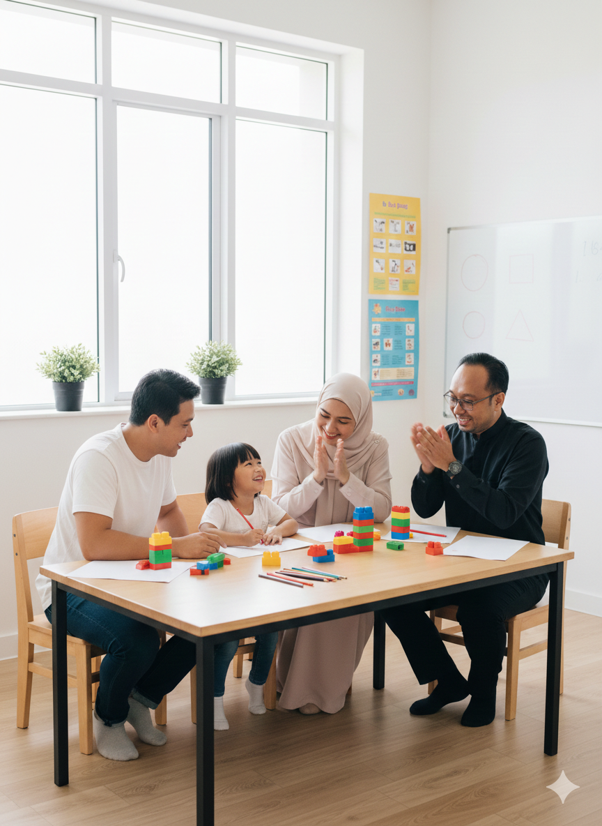 Kelas intensif selama 1–3 hari (ikut tahap anak) dengan hasil yang boleh dilihat seawal hari pertama, termasuk pemahaman autisme, teknik ‘reset’ tingkah laku, dan sesi lanjutan jika perlu.