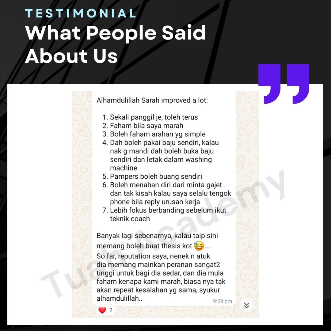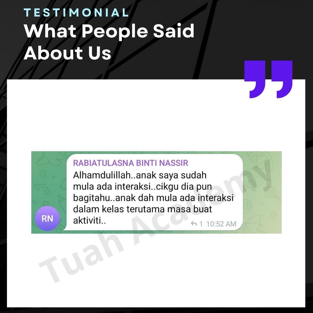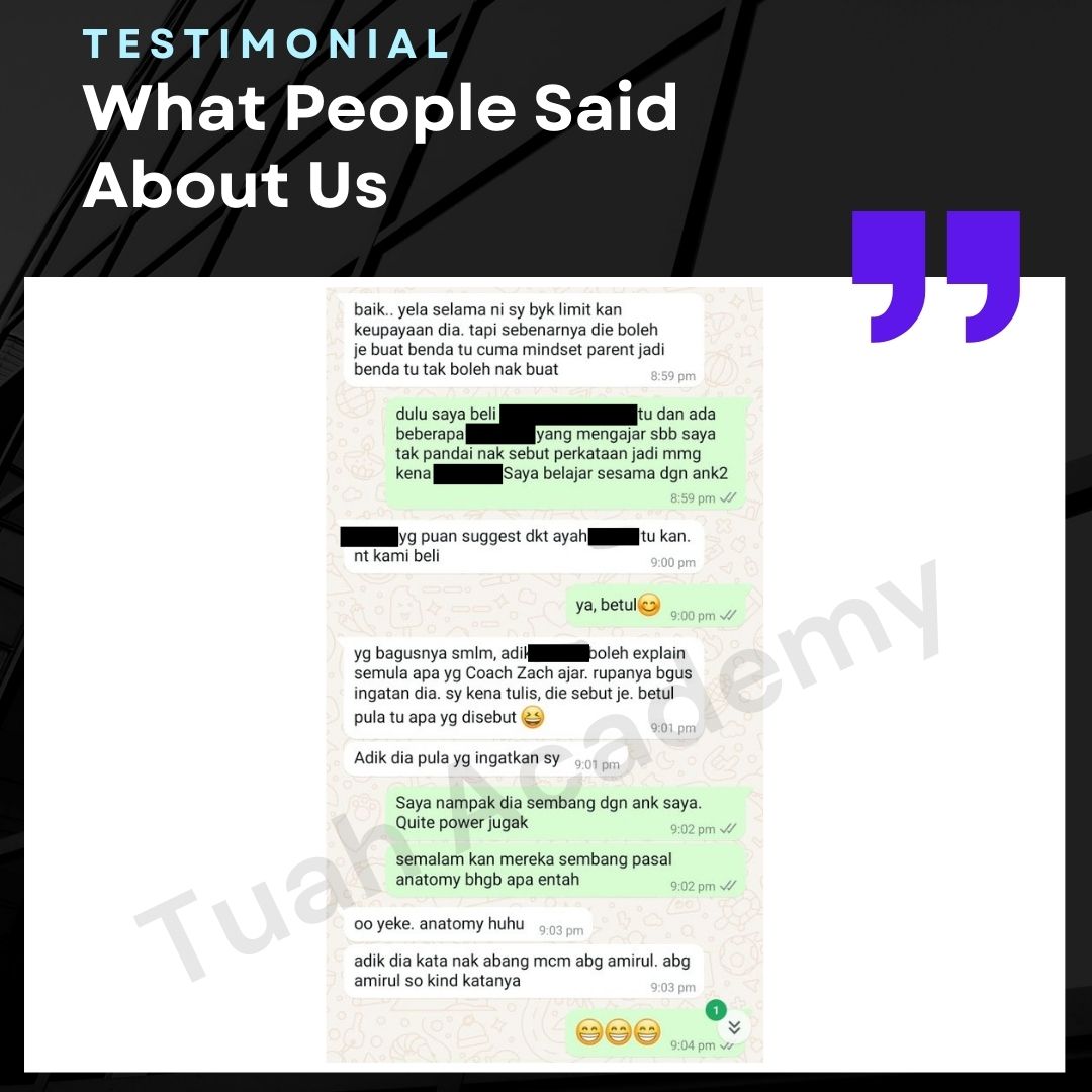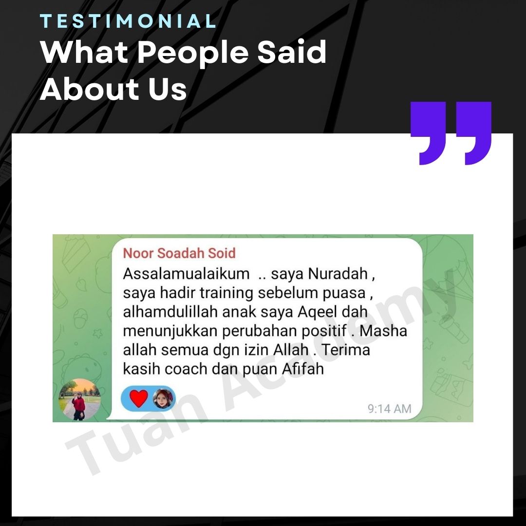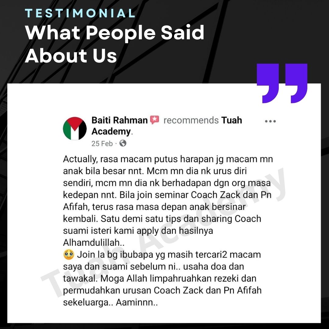 Saya Ingin Berkongsi Testimoni Real Stories, Real Change: Story Ibu Bapa ! Dari keliru kepada yakin, dari buntu kepada bertindak. Ini kisah sebenar ibu bapa yang telah menyertai Tuah Academy dan melihat perubahan dalam anak mereka. Lebih peluang, lebih manfaat Jadi ahli NGO kami. Borang diskaun sehingga 80% Isi di sini!